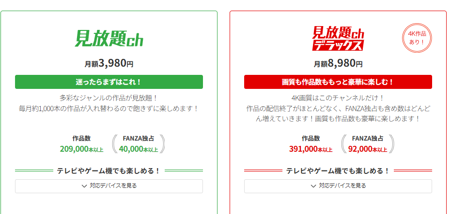 FANZAの見放題デラックス)は、月額8,980円で膨大なラインナップを楽しめます。